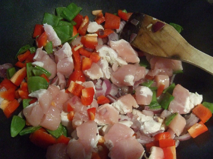 Lube up your FINEST WOK. No second best-sies unless the best ones pending a wash or you lent it to someone and it MYSTERIOUSLY DISSAPEARED in which case it's a write-off, don't kid yourself. Loosely chop up chicken fillets, onion, red pepper and the obligatory spare vegetable you have around, mine's mangetout peas.